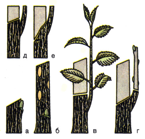 Обрезка привитого подвоя: а) на глазок, б) на язычок, в) на побег, г) правильно, д, е) неправильно