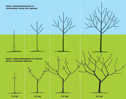 После посадки последовательность обрезки у всех форм одинакова. Оставляют только три, максимум — четыре боковые ветви примерно одинаковой толщины, равномерно направленные во все стороны, а также центральный проводник, лидер, являющийся продолжением ствола. Только у яблони и груши с коротким плодоносным обрастающим скелетом оставляют до 5 таких ветвей. Если у саженца больше побегов, их вырезают у самого ствола «на кольцо». Сначала укорачивают боковые, вторичные ветви, растущие в стороны, а затем конкуренты, растущие из боковой почки прямо вверх. У деревьев, обладающих нормально развитой корневой системой, которые были высажены осенью, прежде всего укорачивают самое верхнее плечо примерно на 2/3 его длины, а затем нижние — примерно наполовину. При этом надо проследить, чтобы оставшаяся верхушечная почка была направлена к нижней стороне кроны, а концы укороченных скелетных ветвей оставались приблизительно на одном уровне.