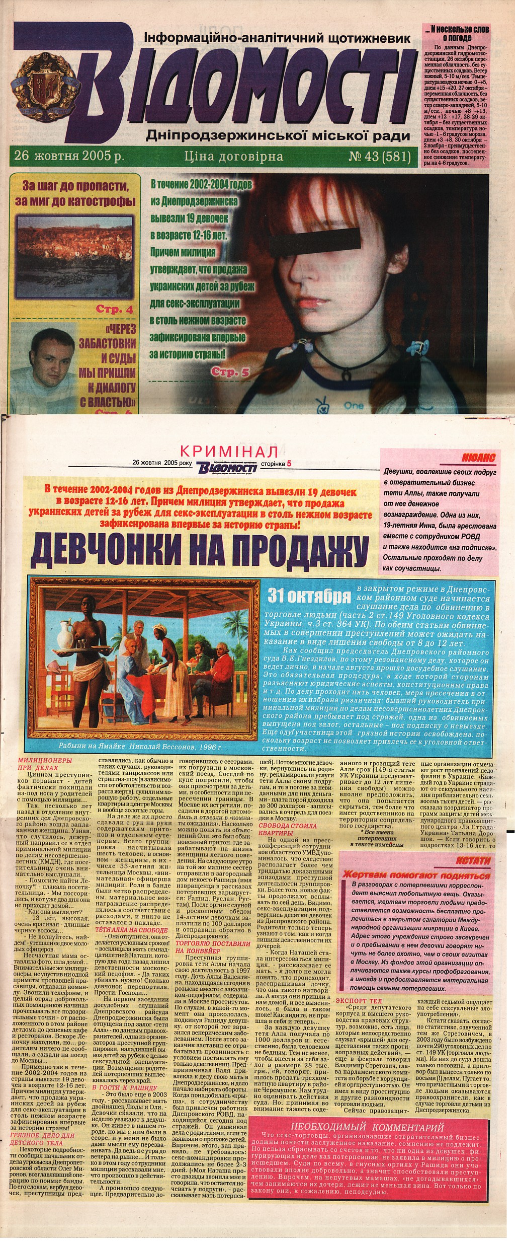 В течение 2002-2004 годов из Днепродзержинска вывезли 19 девочек в возрасте 12-16 пет. Причем милиция утверждает, что продажа украинских детей за рубеж для секс-эксплуатации в столь нежном возрасте зафиксирована впервые за историю страны!