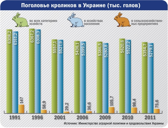 Непросто поверить, однако в середине 1980-х годов украинские кролиководы обеспечивали едва ли не десятую часть вселенского объема крольчатины, продавая каждый год в пределах 140 тыс. тонн мяса и 40 млн шкурок. Теперь же производят в шесть раз меньше, хотя спрос на эту продукцию в мире сохранился. В рознице один килограмм мяса кролика в среднем стоит 50–70 грн. Но даже высокая цена не отпугивает покупателей. Подсчитано, что в месяц украинскому рынку требуется по крайней мере 40–45 т мяса кроликов.