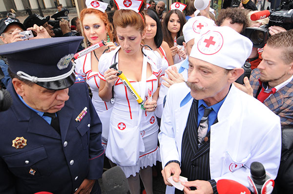 Комики, наряженные врачами и медсестрами, приготовили для депутатов таблетки «Правдогон», «Совестин» и «Антикоррупцин», глазные капли «Реальность», а также уколы для улучшения памяти — чтобы те вспомнили свои предвыборные обещания.