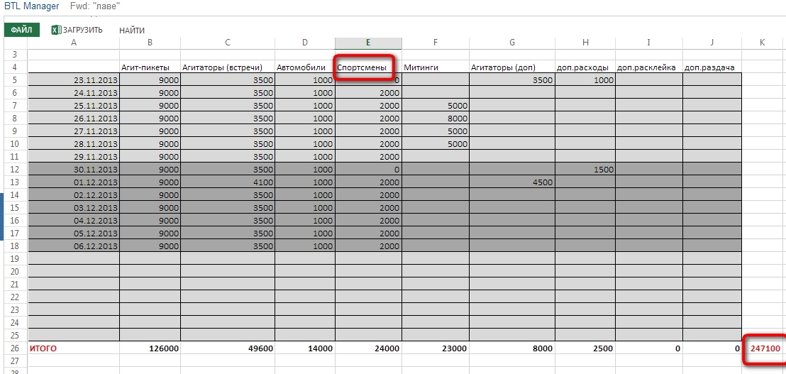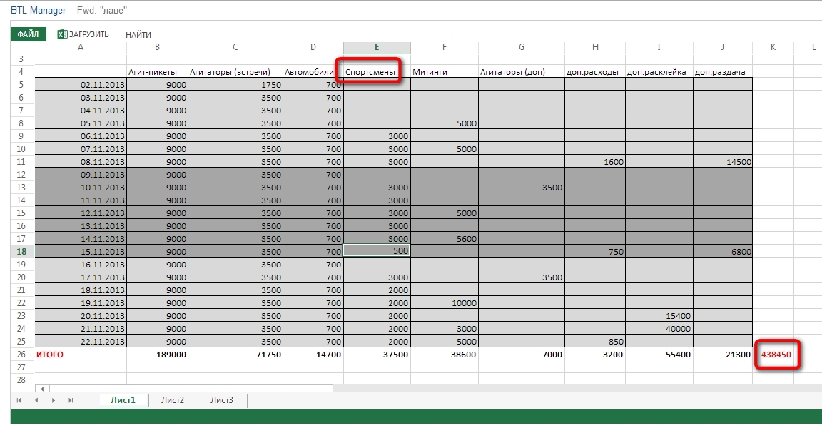 Финансовая отчетность за «поле» лежит на BTL-менеджере, из-под руки которого и вышел бюджет кампании. Сам жиган-лимон менеджер финансовые документы по-простецки называет «лаве».  Только за ноябрьские «полевые» работы Ляшко с Шиловой развели спонсоров Алежки почти на 700 тысяч гривень.