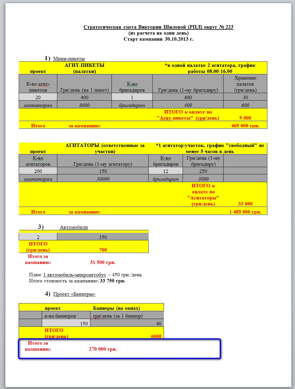 На весь округ работает только 20 палаток с двумя мерзнущими студентами внутри. За 200 гривень в день люди в накидках а-ля «Мы с тобой одной крови» раздают газетку и бубнят под нос биографию Шиловой. Эта статья расходов предусматривает  чуть больше четырехсот тысяч гривень.