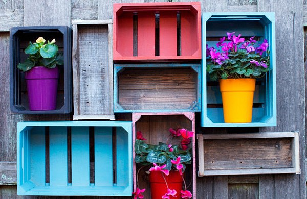 Вам необходимо разместить ящики на заборе так, чтобы их композиция выглядела эстетично, для этого советуется складывать как вертикально, так и горизонтально. В итоге у вас выйдет набор ниш разной длины, ширины и глубины. Однако такой творческий беспорядок будет играть лишь на руку, симметрии добиться в любом случае было бы трудно, да и по мнению дизайнеров – это лишнее.