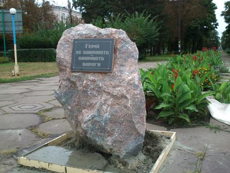 Новый памятный знак появился в Днепродзержинске. Его установили в центре города за, пока еще не демонтированным, постаментом ленина. Памятный знак выполнен из гранитного камня и таблички с надписью «Герої не вмирають. Вмирають вороги!».