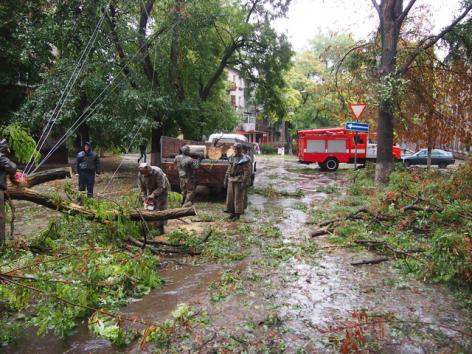 По улице Магнитогорской огромное дерево упало и перегородило дорогу. Движение стало невозможным. Также в этом же районе оборвало линии электропередачи, как результат — остались без света десятки домов. По улице Мира дерево упало на легковой автомобиль, сильно его повредив. На Медицинской еще одно дерево раздавило автомобиль «Вольво». В Баглейском районе ситуация катастрофическая: во дворах воды по колено, деревья лежат на тротуарах и проезжей части. В Левобережной части города ветром повырывало многолетние ивы и ели. Во многих районах пропало кабельное телевидение и электроснабжение. Во многих местах валяются вырванные бигборды, а на мосту через Днепр, от шквального ветра перевернулась многотонная фура.