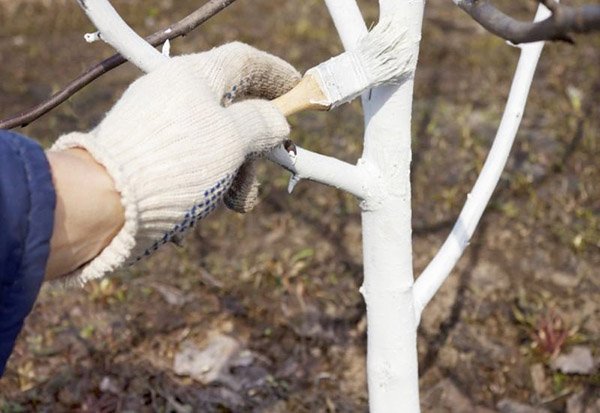 Второе, что следует сделать, это покрасить ствол дерева садовой краской. Она защитит дерево от грызунов, зайцев и других вредителей. К слову, краска также станет преградой от солнечных ожогов, которые в зимнее время наиболее опасны. Кстати, от зайцев, если вы наверняка знаете, что они водятся на вашем участке, ствол можно еще обвязать сеткой для овощей, или даже металлической строительной сеткой. Никакого вреда дереву она не принесет, а вот в случае атаки зайца гарантирует 100-% защиту. Некоторые садоводы для этой цели обвязывают стволы деревьев различными подручными материалами, тряпками, полиэтиленом и так далее. Делать это категорически не советуется, так как кора может во время оттепели на солнышке нагреться, начнется подопревание.