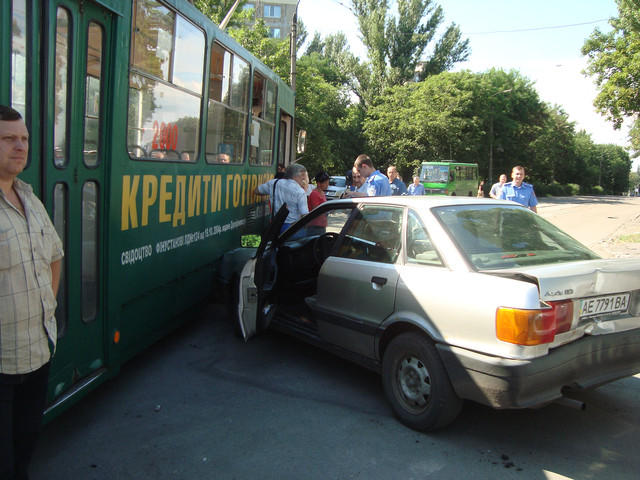В тупике первого трамвая, автомобиль АУДИ врезался в вагон. Как позже выяснилось, водитель пытался избавиться ои преследования правохранителей. Как сообщили милиционеры, они заметили автомобиль, который числился в угоне. Водитель попытался скрыться, но врезался в трамвай. К счастью, потерпевших нет, да и сам трамвай практически не получил серьезных повреждений. Угнанный автомобиль получил серьезные повреждения кузова. Угонщика милиция задержала. Есть подозрения, что он находился за рулем в состоянии алкогольного опьянения или под воздействием наркотических средств.