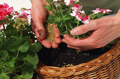 Перед тем как внести удобрение длительного действия, нужно измерить диаметр горшка либо вазона – от этого показателя зависит количество расходуемого препарата. На килограмм земли обычно уходит 5 граммов гранул. Для балконных растений расход увеличивают, это прописано обычно и в инструкции по применению подкормки. Если удобрение имеет форму палочек, то их размещают на расстоянии 1-3 см от края горшка на глубину 4-5 см. Гранулы же просто рассыпают по поверхности, смешивая с верхним слоем почвы. После закладки удобрения растения желательно сразу же полить.