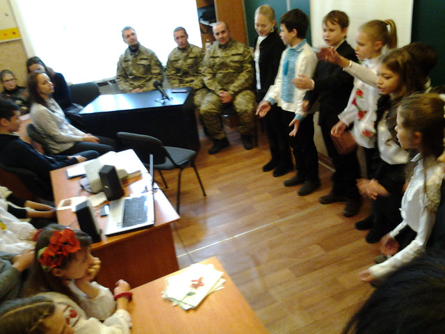 В 30–ю школу приехали с фронта бойцы Добровольческого Украинского Корпуса «Правого Сектора». На встречу с ними пришли учителя, родители, школьники и представители общественности. Учащиеся организовали для воинов мини-концерт.