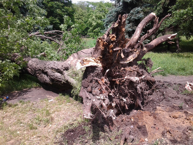 На жилом массиве Черемушки, дерево упало прямо на козырек подъезда. Спасатели оперативно прибыли на место и несколько часов вели работы по разблокированию. В Баглейском районе еще одно дерево упало на киоск. В нем находилась женщина. Она не пострадала, но довольно долго ждала пока спасатели распилят обломки и ей можно будет безопасно выйти из ловушки, в которую превратилось ее рабочее место. Сильный ветер повалил и несколько столбов, а в районе подъема на мост даже сорвал крышу.