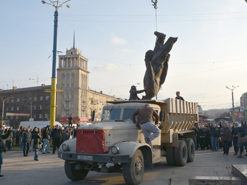 Как позже выяснилось, технику для сноса идола организовали сами коммунисты. Они это аргументировали тем, что хотят сохранить ленина для себя. Другой ленинский истукан получил различные повреждения. Напомним, днем ранее ленин спустился к народу и в Днепропетровске.