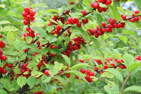 Как уже говорилось раньше, в некоторых регионах войлочная вишня более известна как декоративное растение. Эта культура действительно поразительно украшает участок. Во-первых, стоит сказать о самом дереве – оно выглядит необычно, даже его кора и ствол добавляют в сад атмосферу некой загадочности и экзотики. Что же касается плодов, то когда ими усыпано дерево, то в саду стоит непередаваемое зрелище. Плодов на дереве действительно много и поэтому культура выглядит поразительно красиво – красные мелкие налепившиеся на ветви плоды отлично сочетаются со свежими зелеными листьями, аккуратно прикрывающие их.