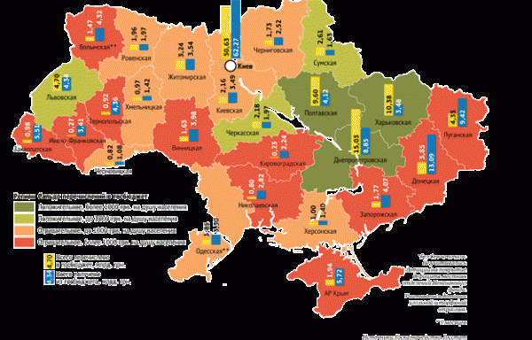 Очень специфические показатели у Киева. С одной стороны, город генерирует около 40% доходов госбюджета (без учета таможенных), поскольку именно здесь зарегистрированы и платят налоги многие украинские предприятия. С другой, субвенции и дотации на выполнение функций столицы, целевые платежи на строительство метро, мостов и дорог, а также ассигнования многочисленным бюджетным организациям с лихвой перекрывают поступления и превращают Киев в самый дотационный регион из рассматриваемых двадцати шести.