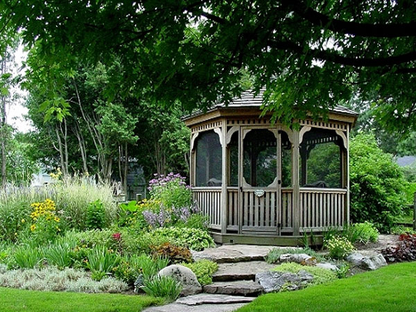 Беседка в саду – это прежде всего место для обедов. Беседка представляет собой оборудованное место со столиком и местами для сидения, впрочем, беседка может располагать и лишь лавочкой для отдыха. Беседка чаще всего представляет собой открытый объект с навесом – в наши дни на беседках модно оборудовать камин, мангал или даже полноценную кухню.