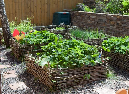 Ну и, наконец, борта грядок могут быть и плетеными. Их можно изготовить даже своими руками. Для этого годятся однолетние порослевые побеги ивы, осины, клена ясенелистного, стволики орешника. Они в большом количестве образуются там, где проводят рубки, например, под высоковольтными линиями. Побеги срезают с осени до весны, когда они одревесневают, но еще сохраняют гибкость. Если не можете приступить к плетению сразу, храните их во влажной ткани, но не больше 3-5 дней, иначе они могут почернеть. Изнутри дно и борта грядки выстилают черной пленкой или нетканым укрывным материалом. Для узких грядок лучше брать именно пленку – она сохраняет влагу.