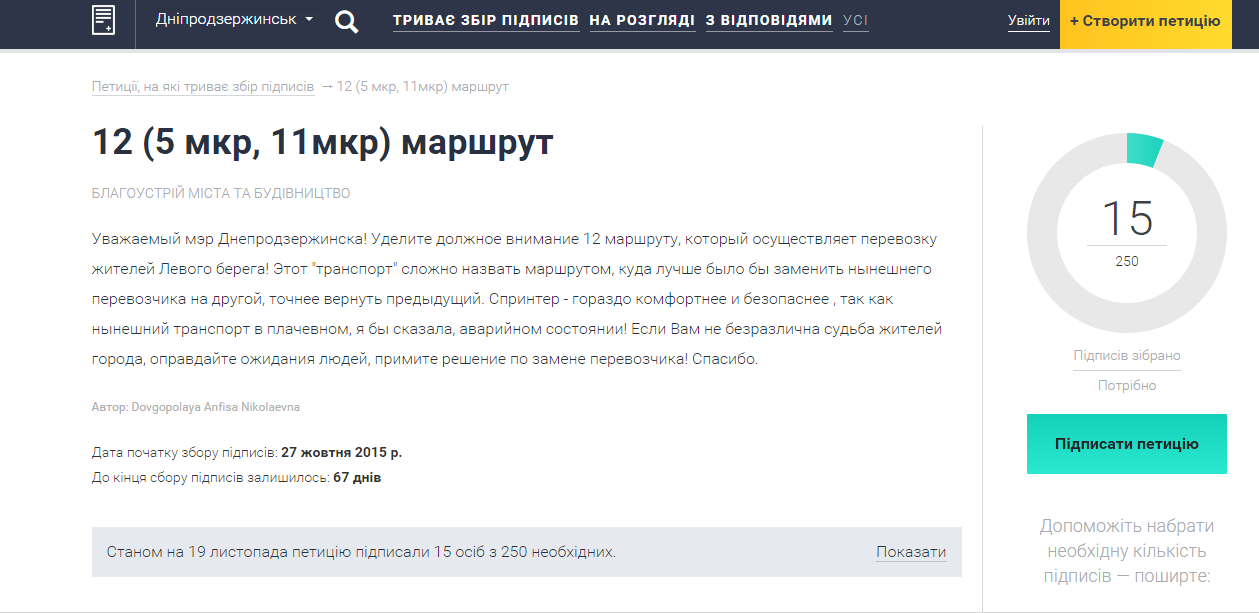 «Уважаемый мэр Днепродзержинска! Уделите должное внимание 12-му маршруту, который осуществляет перевозку жителей Левого берега. Этот «транспорт» сложно назвать маршрутом. Куда лучше было бы заменить перевозчика на другого. Точнее, вернуть работавшие ранее «Спринтеры» – они гораздо комфортнее и безопаснее, так как нынешние автобусы пребывают в аварийном состоянии».