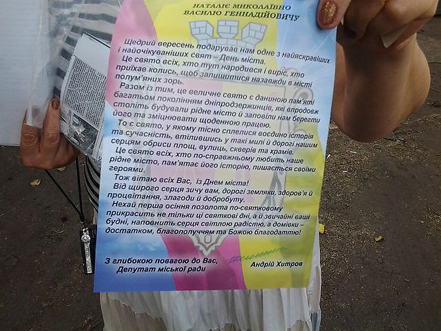 Он решил поздравить жителей Днепродзержинска с Днем города. Точнее не всех жителей, а только тех, кто проживает в районе, по которому он снова выдвигается в депутаты. Горожанам раздали глянцевые красочные плакаты и все бы ничего, но… людей крайне смутило то, что на каждом поздравлении были их инициалы. Получается, что Хитров, пользуясь своим служебным положением, получил в свое распоряжение базы данных потребителей «Горводоканала».
