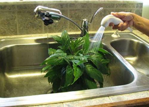 Впрочем, некоторые другие растения наоборот нуждаются в частом увлажнении и им будет недостаточно даже регулярного протирания губкой. В этом случае на помощь придет полноценный душ, при котором растение можно сполоснуть под непосредственным напором воды. Перед душем обязательно нужно прикрыть почву в горшках полиэтиленовой пленкой, чтобы избежать ее вымывания из горшка и предупредить излишнее переувлажнение. Удобнее всего мыть растения в ванной, используя душ. При этом можно поставить горшок на дно ванны и руками подставлять листья под струю воды, смывая с них пыль. Или же держать горшок в руке под наклоном, чтобы вода не попадала на грунт. Особо загрязненные участки можно удалять с помощью щетки или губки. Растения, живущие на кухне, можно мыть с мылом, для остальных достаточно просто теплой воды.