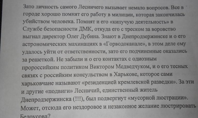 Текст начинается с информации о милицейском прошлом Лесничего: «Все в городе хорошо помнят его работу в милиции, которая закончилась убийством человека». Не прошли и мимо периода, когда глава НФ трудился на ДМК: «Помнят и «кипучую деятельность» Лесничего в службе безопасности ДМК, откуда его с треском выгнал Олег Дубина». В листовке утверждается, что на посту руководителя «Горводоканала» нынешний лидер «Народного фронта» осуществлял крупные махинации, за что поплатились его подчиненные. Напоследок ему вспомнили сотрудничество с консулом россии и «украинским выбором» Медведчука.