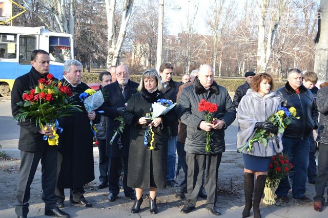 У памятного знака жертвам Голодомора собрались представители муниципальной власти, во главе с мэром, и простые горожане.