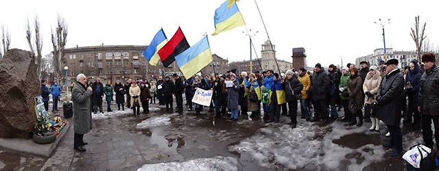 С такими плакатами жители города вышли на центральную площадь в воскресенье. Акция памяти проходила под красно-черными и государственными флагами. Также Многие держали плакаты «Я – Крым» и «Нет войне».