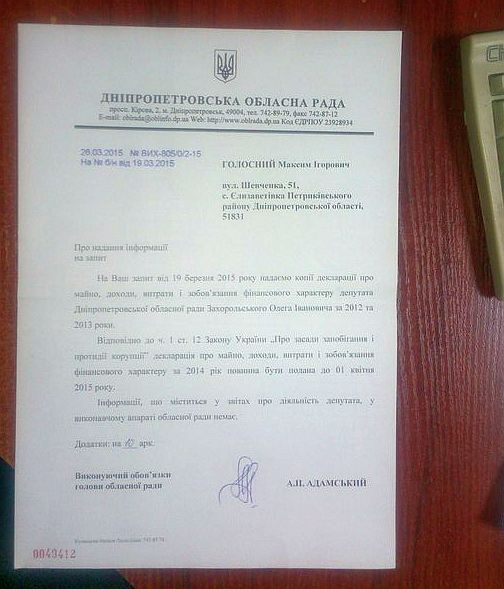 Максим Голосной на своей странице в Facebook сообщил о том, что Днепропетровскому областному совету, депутатом которого является Олег Захорольский, ничего не известно о его депутатской деятельности.