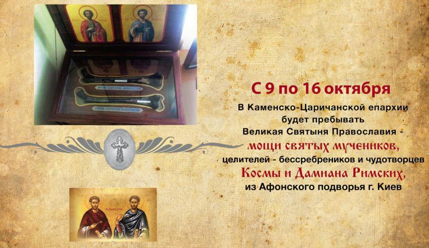 С 9 по 16 октября в Каменском Свято-Николаевском кафедральном соборе будет находиться святыня — ковчег с мощами святых мучеников Космы и Дамиана Римских, чудотворцев и бессребреников.