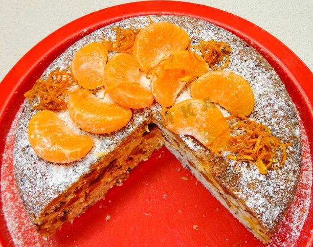 - После этого украшаем сахарной пудрой, дольками мандаринов и цедрой апельсина. Можно вообще устроить огненную феерию-полить ромом и поджечь. Фантастическое зрелище!