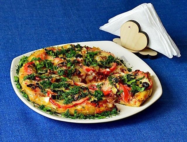 18. Подаём пиццу на стол горячей, посыпав мелко рубленной зеленью укропа и петрушки.