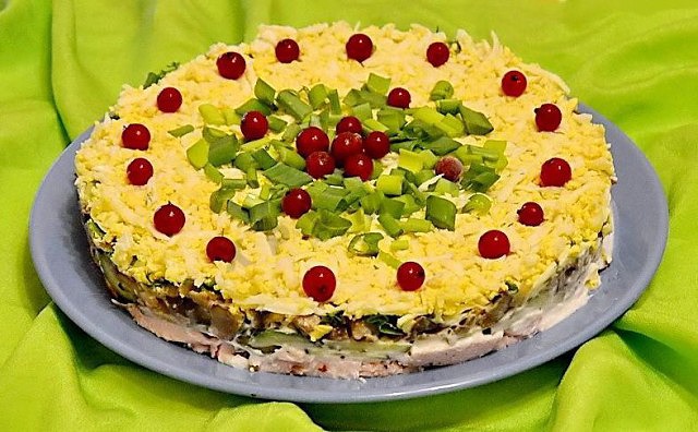 - И в конце — яйца, соль. Украшаем по своему вкусу зеленью, измельчённым зелёным луком, ягодами. Немного охлаждаем в холодильнике, так салат ещё вкуснее.