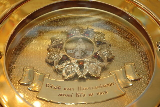 Тело святого, брошенное в костер, осталось в огне неповрежденным и было погребено христианами Святые мощи великомученика Пантелеимона частичками разошлись по всему христианскому миру: честная глава его находится ныне в Русском Афонском монастыре во имя великомученика Пантелеимона.