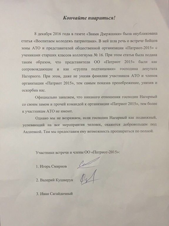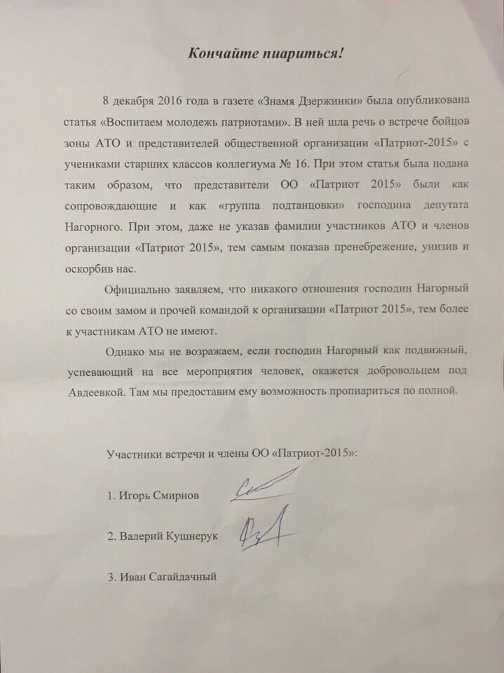 8 декабря 2016 года в газете «Знамя Дзержинки» была опубликована статья «Воспитаем молодежь патриотами». В ней шла речь о встрече бойцов зоны АТО и представителей общественной организации «Патриот-2015» с учениками старших классов коллегиума #16. При этом статья была подана таким образом, что представители ОО «Патриот-2015» были как сопровождающие и как «группа подтанцовки» г-на депутата Нагорного. При этом, даже не указав фамилии участников АТО и членов организации «Патриот-2015», тем самым показав пренебрежение, унизив и оскорбив нас.