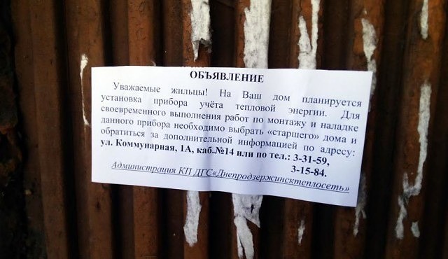 «На Ваш дом планируется установка прибора учета тепловой энергии. Для своевременного выполнения работ по монтажу и наладке данного прибора необходимо выбрать старшего дома и обратиться за дополнительной информацией по адресу: улица Йосипа Манаенкова (Коммунарная) 1а, кабинет 14».
