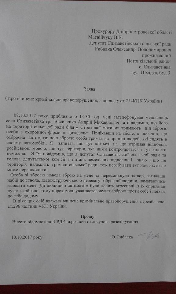 Несколько дней назад Александру Рыбалко (депутату Елизаветовского сельского совета) позвонили жители и попросили о помощи – их держали на прицеле боевики с нашивками «Цитадель». После того как депутат приехал он сообщил молодчикам с автоматами, что он является главой депутатской комиссии по земельным вопросам и ему точно известно, что данная территория находится в собственности у громады села, и любой желающий может по ней передвигаться. По словам депутата, неуравновешенные молодчики после этих слов передернули затвор на орудии и направили прицел на него.