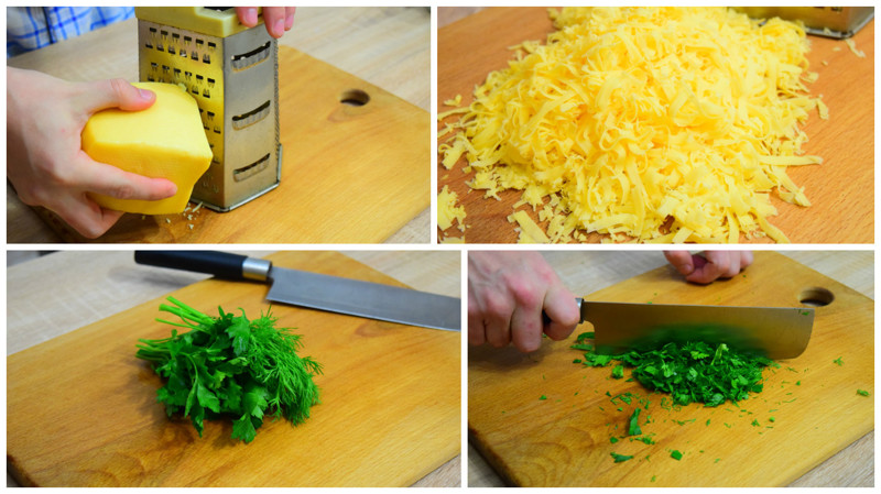 Натираем сыр, зелень измельчаем