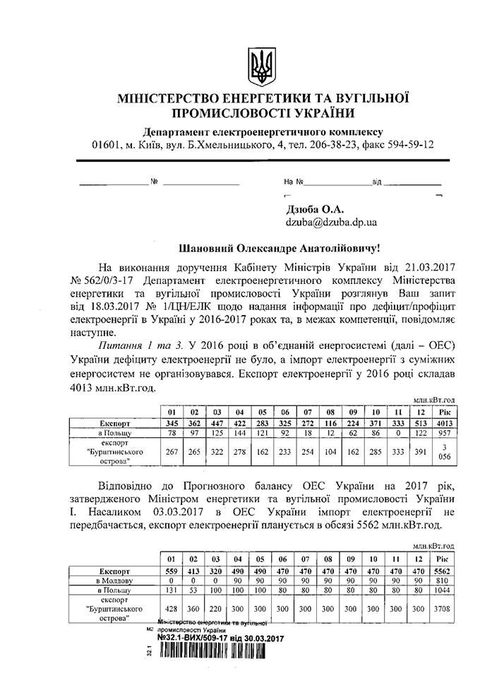 Дзюба О. А подал запрос в министерство энергетики и угольной промышленности Украины. Из ответа чиновников следует, что согласно официальных сведений от Министерства энергетики в 2016-2017 годах дефицита электроэнергии в Украине не было НИКОГДА. Больше того, присутствуют постоянные планы на экспорт электроэнергии.