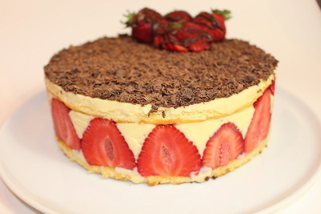 Ингредиенты: сахарный сироп: вода – 100 мл., сахар – 100 мл. бисквит: яйца куриные – 3 шт., ванильный сахар – 10 г., сахар (песок) – 100 г., разрыхлитель – 1 ч. ложка, крахмал картофельный — 2,5 ст. ложки, мука – 50 г. крем: яйца куриные – 3 шт., молоко – 400 мл, сахар – 200 г., масло сливочное – 200 г., ванильный сахар – 10 г., крахмал картофельный – 6 ст. ложек, желатин – 2 ст. ложки, вода – 50 мл. украшение и начинка: клубника (желательно крупная) – 1 к