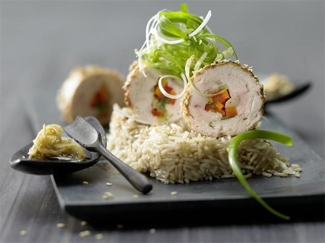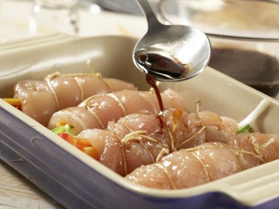 Смешать в маринад соевый соус, 2 ст.л. рисового уксуса и кунжутное масло. Куриные рулеты сложить в форму для запекания, залить полученным маринадом, накрыть пищевой пленкой и поставить в холодильник на 6 часов, а лучше на всю ночь.