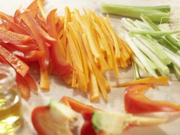 Перец разрезать на четыре части, вырезать семена и нарезать соломкой. Морковь очистить, и так же нарезать соломкой. Зеленый лук очистить, помыть и нарезать тонкой соломкой.