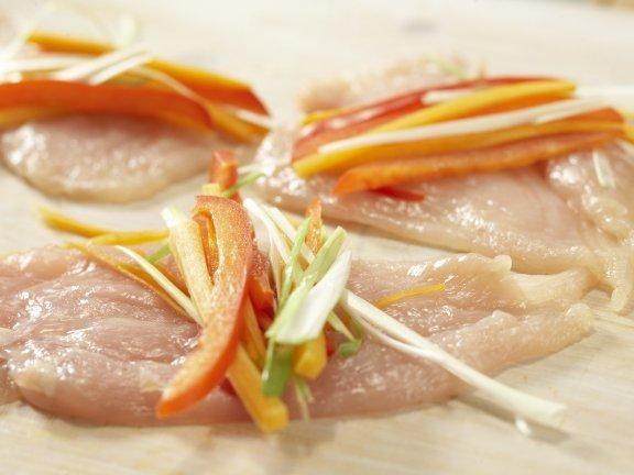 Нарезанные овощи положить в середину отбитых кусков мяса.