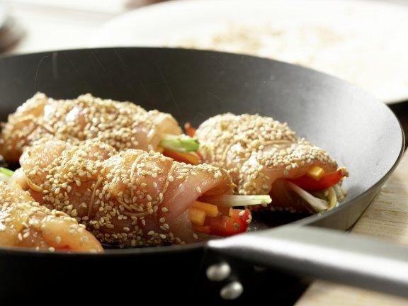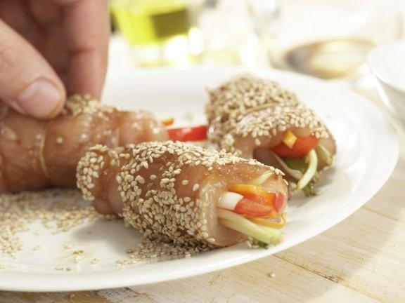 Мясные рулеты вынуть из маринада, промокнуть, обвалять в кунжуте.