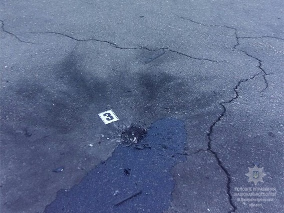 При осмотре места происшествия была обнаружена воронка в диаметре примерно 12 сантиметров и глубиной примерно 3 сантиметра. Вокруг воронки наслоения копоти черного цвета. Также был обнаружен рычаг запала гранаты, металлическое кольцо с чекой и металлические фрагменты обломков взрывного устройства. Также на месте происшествия находились автомобили, на кузове которых были обнаружены механические осколочные повреждения.