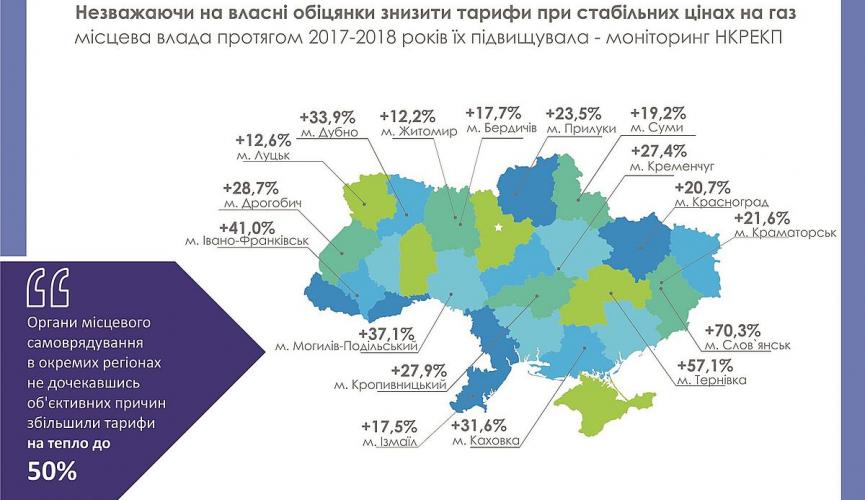 При мониторинге были зафиксированы случаи роста тарифа на 10-20%, в отдельных случаях до 50%, без учета увеличения стоимости топливной составляющей (природного газа). Такая ситуация наиболее выражена в отдельных населенных пунктах Киевской, Днепропетровской, Кировоградской, Винницкой и Полтавской областей, а также в городах Луцке, Житомире, Ивано-Франковске и Тернополе. Например, разница между средневзвешенным тарифом лицензиатов НКРЭКУ на тепловую энергию для населения и установленными органами местного самоуправления города Славянска и Ивано-Франковска составляет 70,3% и 41% соответственно.