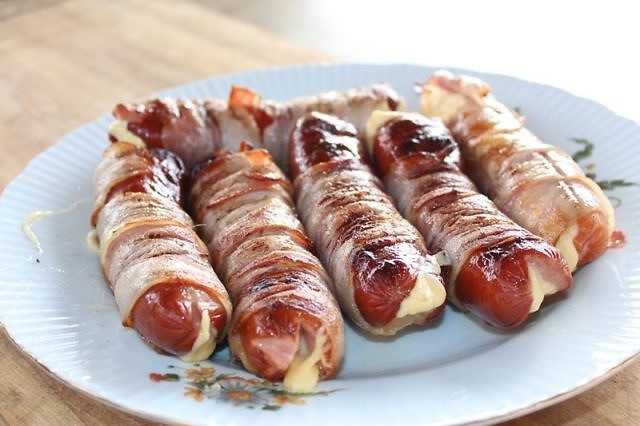 Очень простой дачный рецепт горячей закуски, которая готовится из покупных сосисок, обычного сыра и ломтиков подкопченного бекона. Разрезаем сосиски пополам, выкладываем в разрез сыр, оборачиваем двумя полосками бекона и запекаем блюдо на гриле до красивого подрумянивания. Обязательно попробуйте приготовить такую закуску на даче! И вкусно, и сытно, и времени требует минимум!