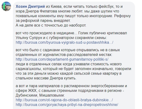 «из Киева, если читать только фейсбук, то и мэра Днепра Филатова многие любят. мы даже шутим что похвальные комменты ему пишут только иногородние. Реформу за реформой парень внедряет.А на деле все с точностью до наоборот.