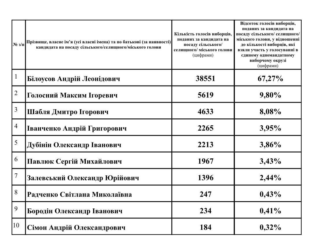 Каменская территориальная избирательная комиссия Каменского района Днепропетровской области огласила официальные результаты голосования по выборам Каменского городского головы.