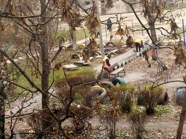 Когда наступала уборка листьев – к дворнику на помощь приходила техника и дополнительные работники. Теперь же никакой техники нет, и гастролирующая группа выносит все по старинке – на покрывале.