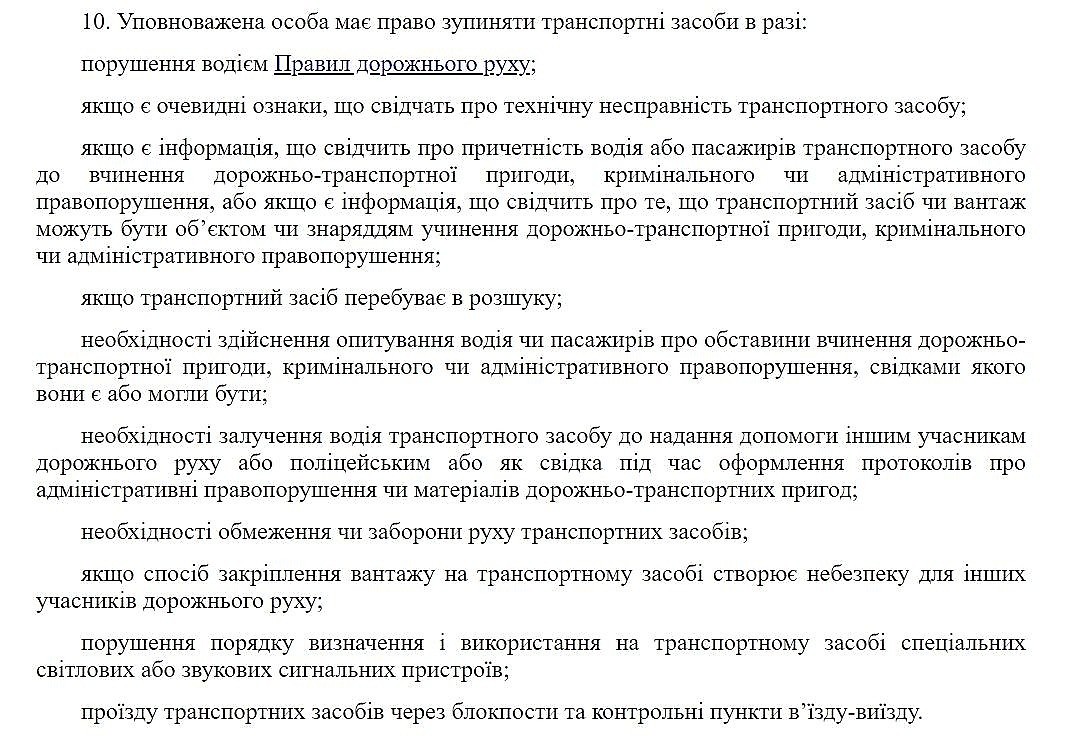Существует определенный Порядок (ссылка). Пункт 10 этого документа определяет четкие случаи, когда уполномоченные лица (полиция, СБУ, Нацгвардия, ВСУ – полный перечень п. 5 Порядка по этой ссылке) имеют право остановить транспортное средство.